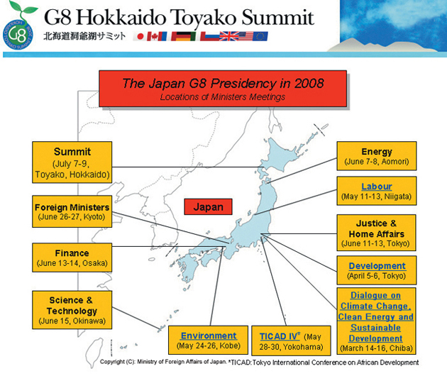 In 2008, Japan assumes the Presidency for the fifth time and will hold the Summit in Hokkaido Toyako in July. The Group of Eight (G8) Summit is an annual meeting attended by the leaders of the eight countries, namely, Canada, France, Germany, Italy, Japan, Russia, the United Kingdom, and the United States of America, and the President of the European Commission. “Summit” in the strict sense means a leaders’ meeting, but it usually refers to a series of meetings which include those of foreign ministers and finance ministers that are held prior to the leaders’ meeting.