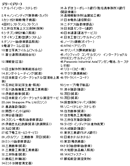 当資料は,在インド三領事館(ムンバイ,チェンナイ,コルカタ)及び各地の日本企業商工会,その他関係機関より情報提供頂き,在インド日本国大使館が取りまとめて作成しております。掲載企業選定基準は以下の通りです。①日本企業が資本参加しており,かつ日本人駐在員が常駐している企業。②技術提携のみの関係については、原則的には掲載しない。但し,以上の基準から外れる企業であってもプレゼンス等を考慮して例外的に掲載されているケースがあります。2005年4月における延べ進出企業数は328社、複数の事業所等を会社単位で整理した進出企業数は267社でした。