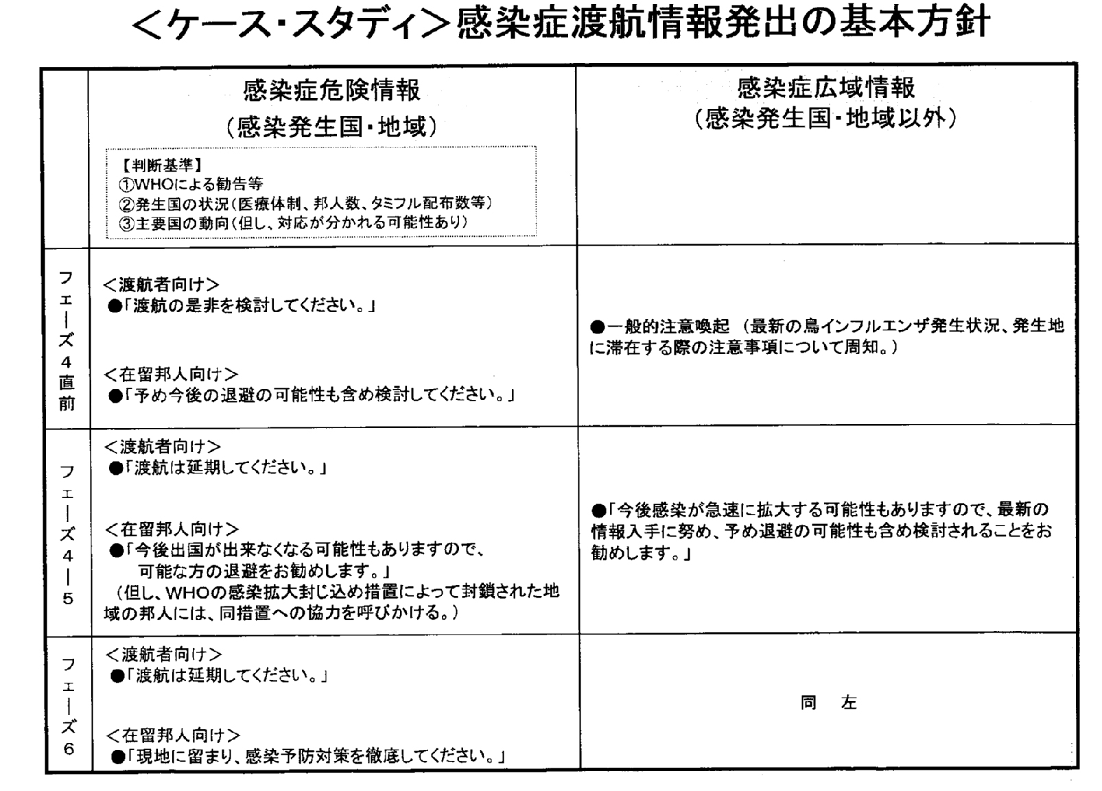 WHOは感染地区について渡航の延期を呼びかけると考えられ、外務省はWHOに倣い、『渡航者向けには渡航延期』を呼びかけ、『在留邦人については可能な方の退避をお勧めする』との情報発出が予定されています。フェーズ4と5の区別をしていないのはフェーズ4から5への進展が予想以上に早い可能性があることや、発生国自身が情報を意図的に隠した場合に、気づいたらフェーズ5であったという状況も想定されるとの考慮によるものです。