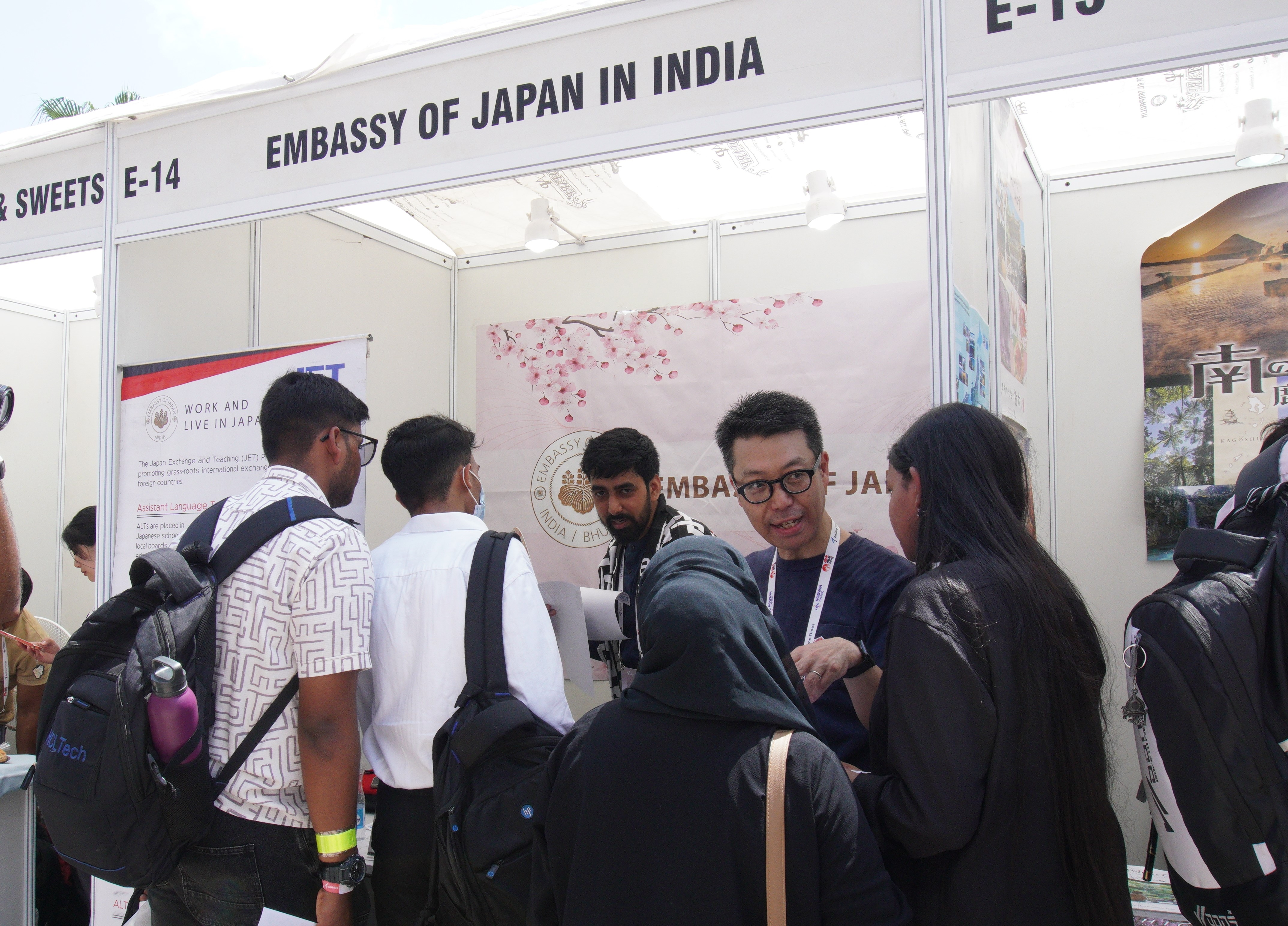 在インド日本国大使館は、外国青年招致業JETプログラムの説明ブースを設置し、プログラムの周知及び応募促進PRを行いました。ブースには日本での就職を考える若者や日本語を勉強する学生等が多く訪れ、プログラムに参加した際の仕事の内容や文化交流の機会などの具体的な情報に熱心に耳を傾けていました。同ブースには二日間で約400人が訪れ、日本への関心が高いことが伺えました。