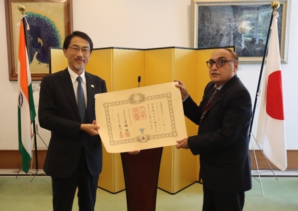 2025年11月28日、小野大使は大使公邸にて、令和7年春に瑞宝双光章を受章されたベディ在インド日本国大使館元現地職員への叙勲伝達式を開きました。