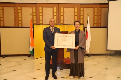 2025年12月18日、小野大使は大使公邸にて、令和7年春に旭日重光章を受章したR.ハリ・クマール元海軍参謀長に対し、叙勲伝達式を開催しました。