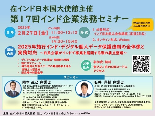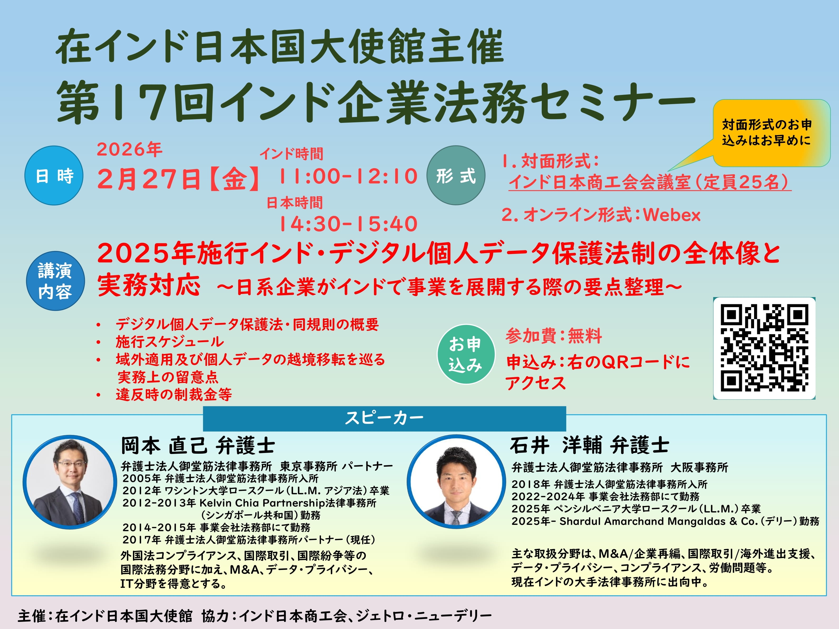 2026年2月27日、第17回インド企業法務セミナーを開催いたします。