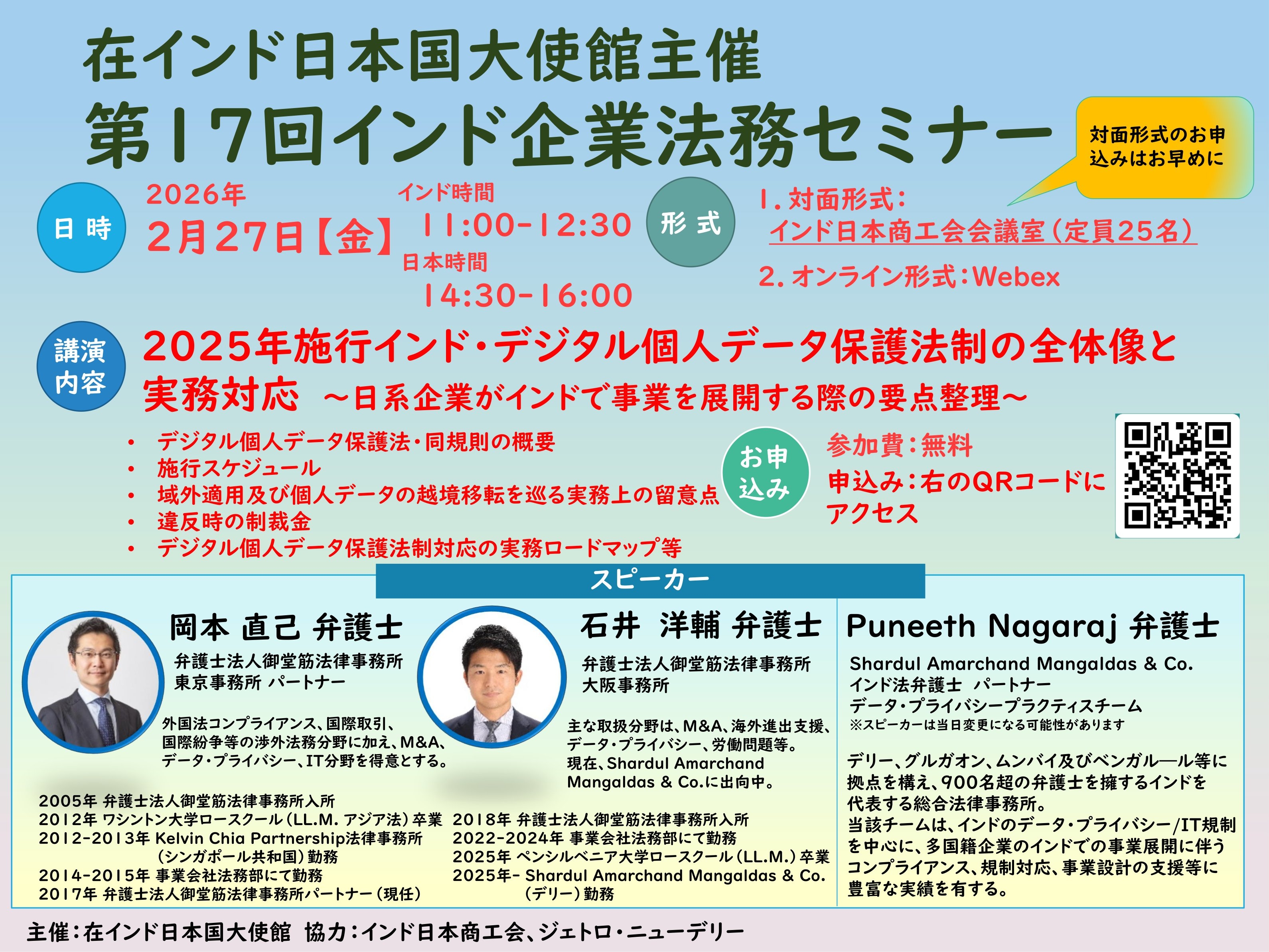 本セミナーでは、弁護士法人御堂筋法律事務所の岡本直己弁護士・石井洋輔弁護士及びShardul Amarchand Mangaldas & Co.のPuneeth Nagaraj弁護士が、「2025年施行インド・デジタル個人データ保護法制の全体像と実務対応~日系企業がインドで事業を展開する際の要点整理~」をテーマに講演を行います。