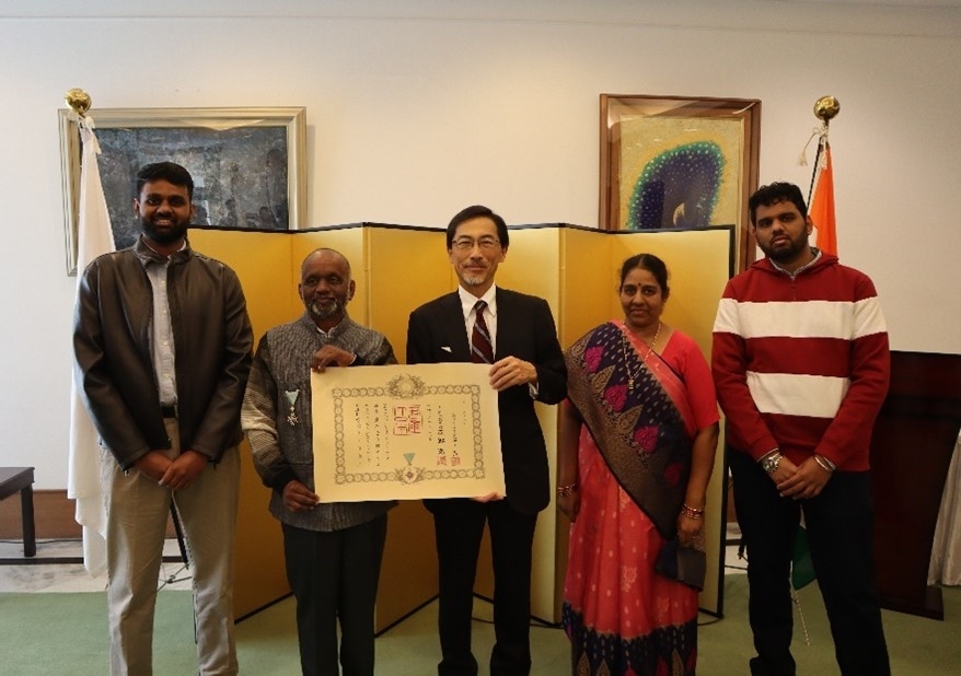 Mr. Bapiraju, the former local employee, Embassy of Japan in India, on his receiving of the Decoration of the Order of the Sacred Treasure, Gold and Silver Rays from the Emperor of Japan.