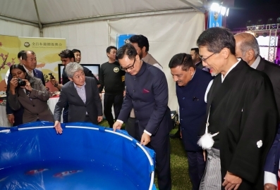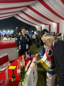 Ambassador Ono guided the chief guest and distinguished guests through the exhibition booths. Local governments from Niigata prefecture, Hokota City (Ibaraki Prefecture), and Kitakyushu City (Fukuoka Prefecture) showcased their regional products, while JETRO Nara presented Japanese Small and Medium-sized Enterprises not yet operating in India. At the seafood booth, guests enjoyed tuna nigiri sushi and yellowtail pressed sushi. A live Nishikigoi display and study-abroad information booths by Japanese universities also attracted strong interest. A sake cocktail booth was also featured and well received by guests.