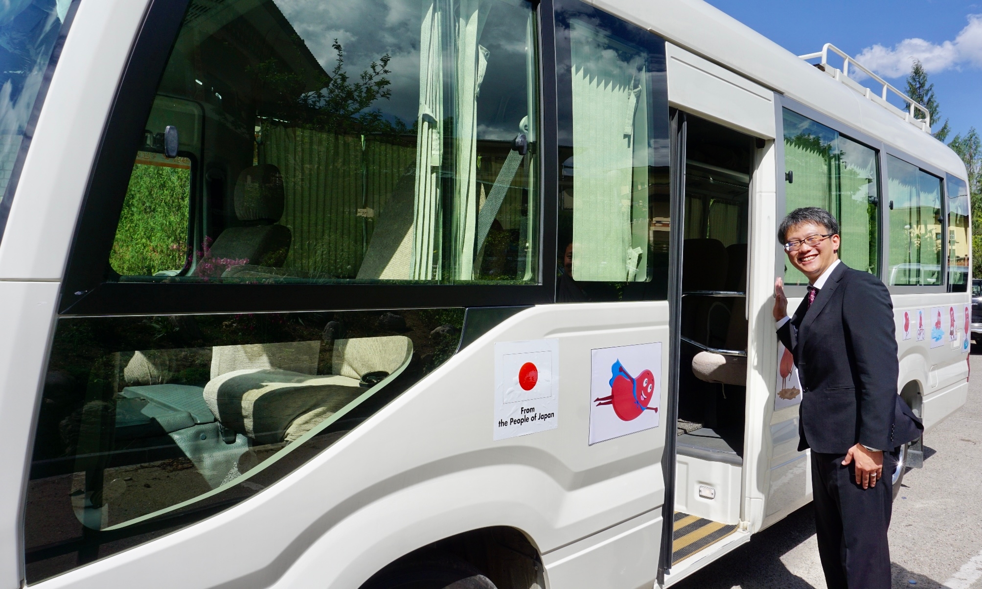 令和4年5月9日、ブータン国首都ティンプーにおいて、令和元年度草の根無償資金協力「農村部貧困層のための非感染性疾患及び腎臓病予防医療巡回バス整備計画」の供与式が開催されました。